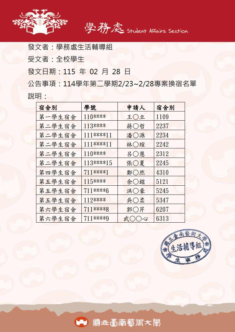 114學年第二學期2/23~2/28專案換宿名單