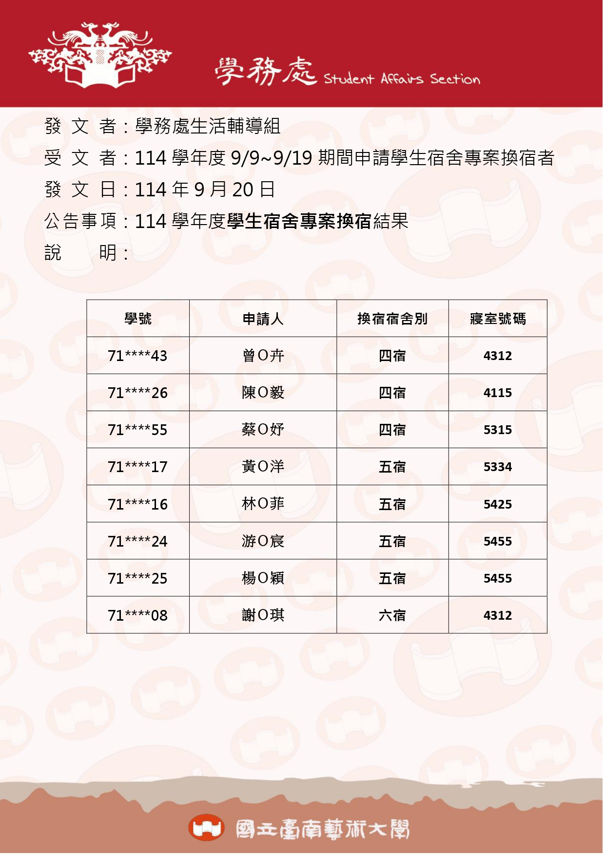 114學年度9/9~9/19期間申請學生宿舍專案換宿結果
